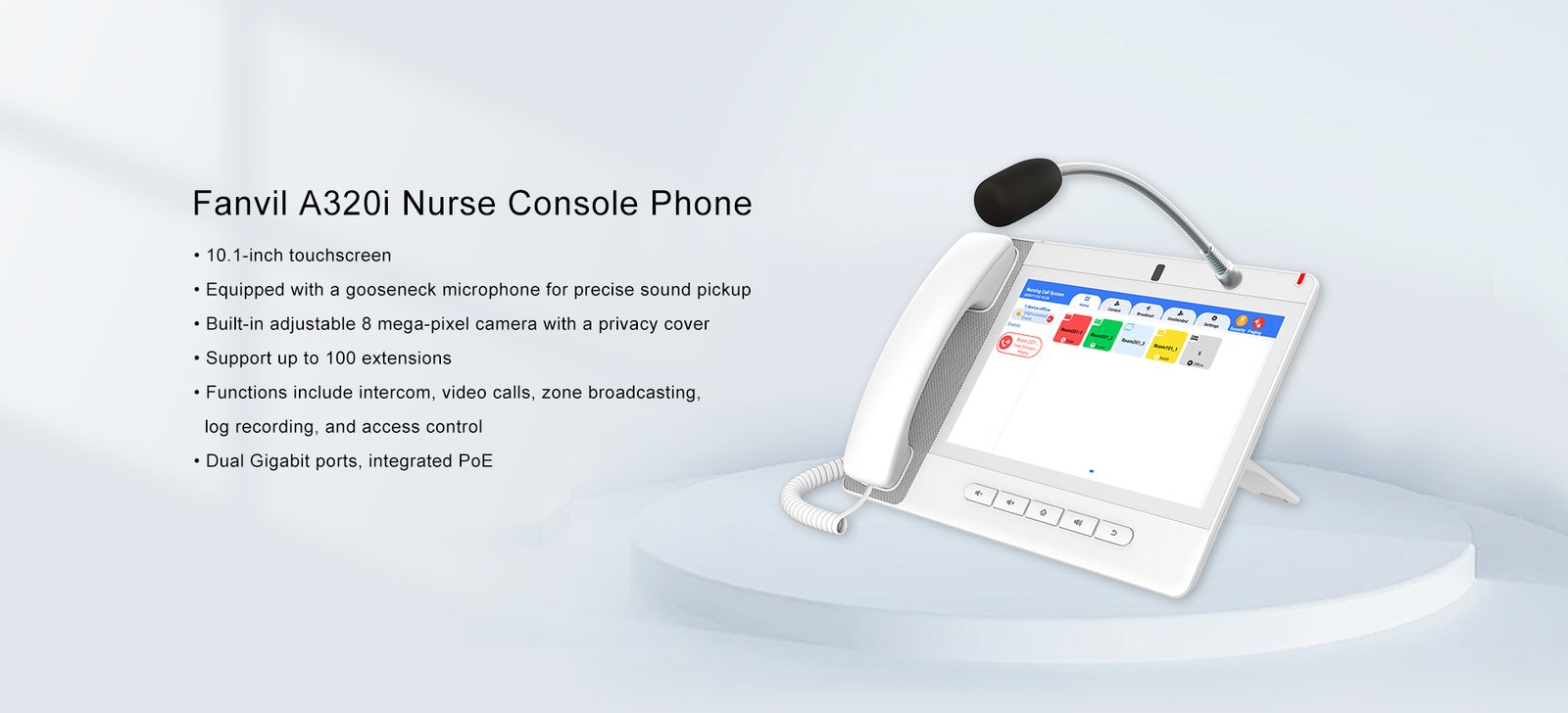 Fanvil Nurse Console Phone A320i (white), utilizing IP and SIP protocol, is an ideal solution for Nursing Homes, Clinics, and other similar facilities like assisted living centers. Designed to provide nurse call and emergency call solutions for caregivers, elders, and patients. The built-in adjustable camera and goose neck microphone, provide 2-way audio and video communication with bedside station or door phone. It also built-in broadcasting function for emergency announcement, zone paging or paging a single device.